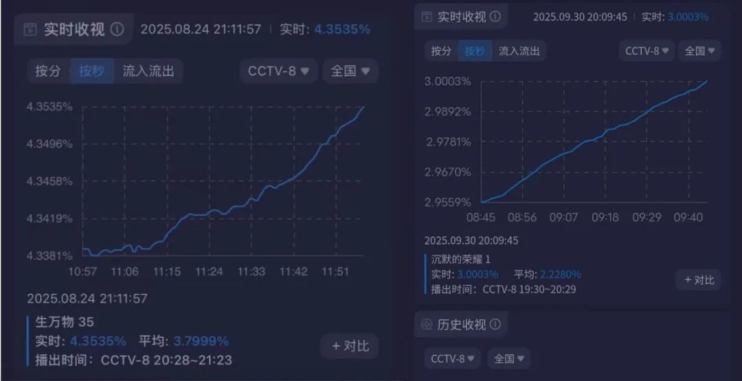 台网双爆成为了显赫亮点之一。如《生万物》以4.3535%的及时收视率峰值,冲破央视八套近三年收视峰值记录,其汇集端市占率峰值也达到了46.1%,创2025年新高。《千里默的荣耀》不仅在爱奇艺站内热度破8500、置身“佳片殿堂”,更成为央视八套本年最快破3的剧集,成绩全网热搜 670+。